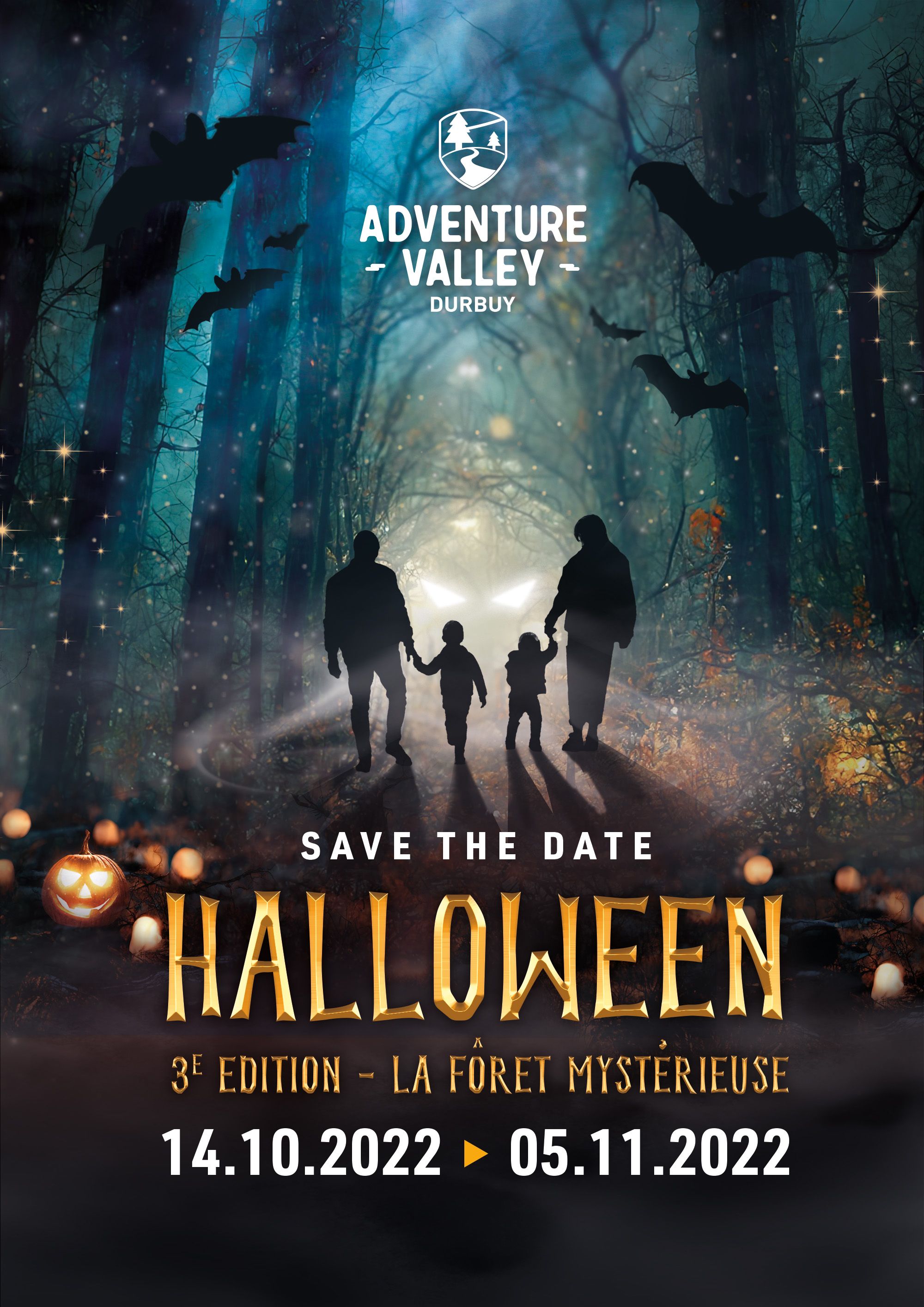"À l'occasion d'Halloween, le parc Durbuy Adventure Valley transformera son parc en Forêt Mystérieuse offrant une promenade illuminée et effrayante de deux kilomètres, dont un cimetière hanté et ses drôles de créatures cachées derrière des formations rocheuses, ainsi que trois sites effrayants sad : le Pitfall, le Labyrinthe et la Clinique.